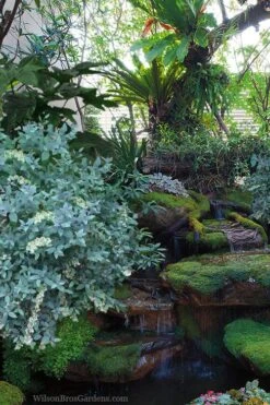 Growing in an arching mound that reaches 3 to 4 feet tall and 4 to 5 feet wide, the Woodlanders Blue Zenobia is ideal for use as an accent, in groupings or in mass plantings in sunny to partly shady areas of the landscape. It’s arching dusty grey-blue foliage provides wonderful contrast of color when combined with plants that have dark color. Â